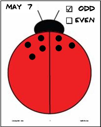 Suggestion for Morning Math Routines: Place a ladybug template in a sheet protector or laminate the ladybug. Use a dry-erase marker to add a new spot each day. Discuss whether the ladybug has an odd or even number of spots, based on whether there are the same number of spots on each side of the ladybug. Incorporate this practice into morning routines to reinforce odd and even numbers.