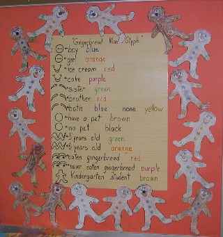 - Gingerbread Person Glyphs:   Create gingerbread people decorations that are glyphs so that they represent the answers to different data-collection questions: boy/girl, like/don't like gingerbread, favorite dessert, etc.